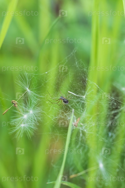 Паук в паутине на лугу