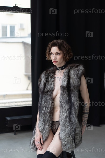 Молодая красивая женщина позирует в шубе в студии