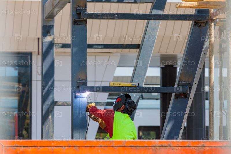 Сварщик скрепляет железные балки сварочным аппаратом. Строительство станции