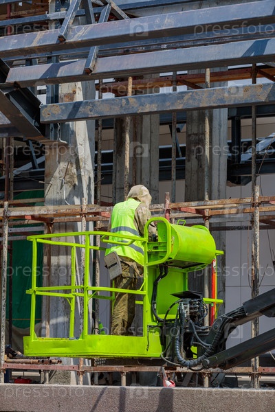 Мужчина - строитель работает на площадке крана на высоте. Строительство станции