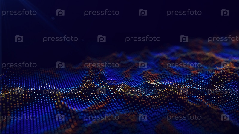 Футуристическая волна. Концепция больших данных. Кибернетика, наука и техника. Абстрактный темный фон из синих и оранжевых точек. Визуализация технологического ландшафта. 3D-визуализация