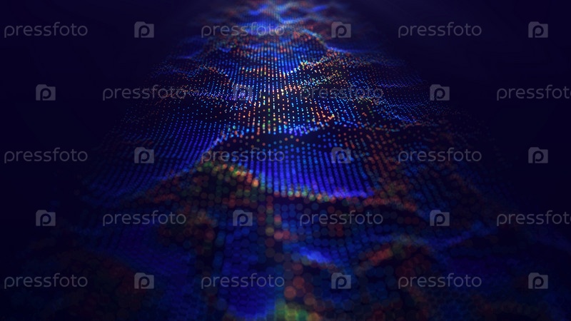 Футуристическая волна. Концепция больших данных. Кибернетика, наука и техника. Абстрактный фон из синих и оранжевых точек. Визуализация технологического ландшафта. 3d визуализация