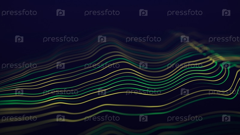 Динамическая желто-зеленая волна на синем фоне. Визуализация больших данных. Футуристическая волна частиц. Наука и технология. 3D визуализация