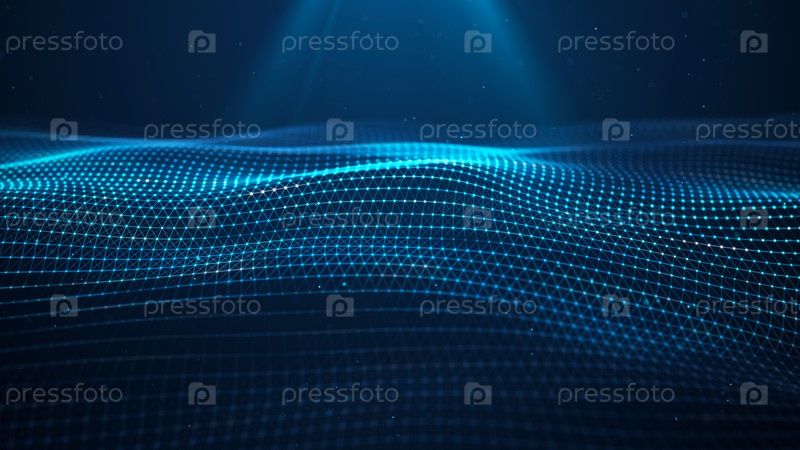 Футуристическая светящаяся волна. Концепция больших данных. Подключение к сети. Кибернетика. Абстрактный фон синих линий с точками. 3d визуализация