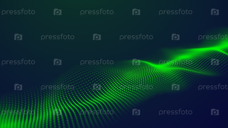 Футуристическая зеленая светящаяся волна. Концепция больших данных. Подключение к сети. Кибернетика. Абстрактный темный фон зелёных линий с точками. 3d визуализация