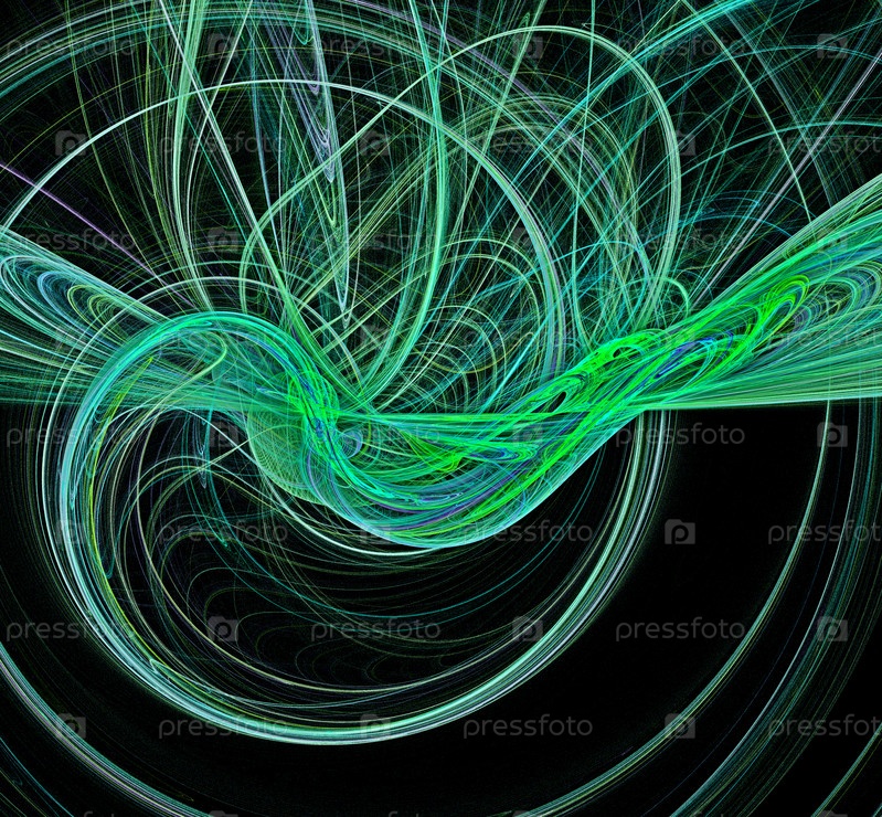 Круги, спирали и волны. хаотичное движение. Абстрактная фрактальная графика. Элемент дизайна. Зеленые и синие оттенки цвета. Черный фон