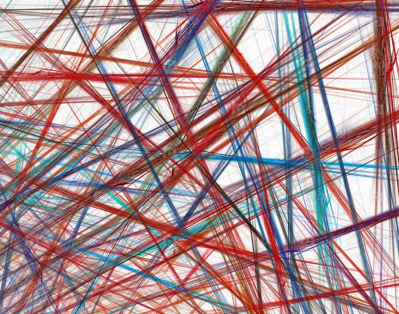 Переплетение нитей, веток, лучей. Абстрактная фрактальная графика. Синие и красные оттенки цвета. белый фон