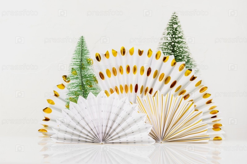 Праздничная композиция с бумажными веерами и новогодними елками на белом фоне с местом для презентации продукта. Рождественский и новогодний праздник фон для показа рекламной продукции