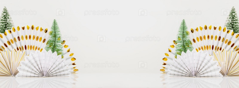 Праздничный баннер с бумажными веерами и новогодними елками на белом фоне с местом для презентации продукта. Рождественский и новогодний праздник фон для отображения рекламной продукции. Размер баннера