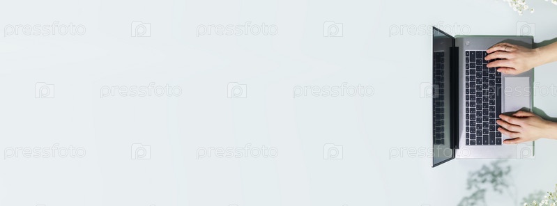 Женские руки печатают на ноутбуке на синем фоне с весенними цветами