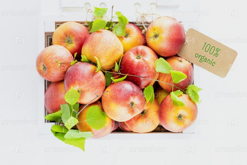 Натуральные красные яблоки в деревянной коробке с этикеткой с текстом 100% органические