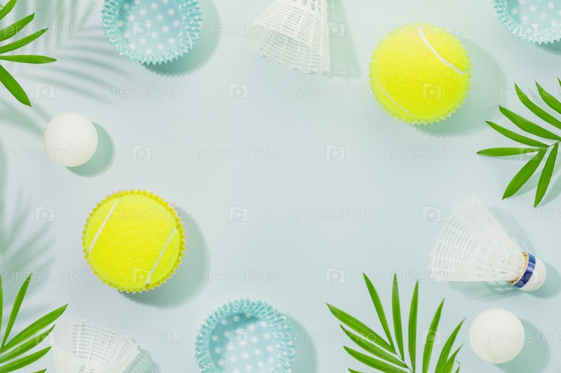 Рамка летних спортивных мероприятий с желтыми теннисными мячами, мячами для настольного тенниса, воланами и пальмовыми листьями на синем фоне. Спорт и здоровый образ жизни. Большой теннис, настольный теннис, бадминтон. Копировать пространство