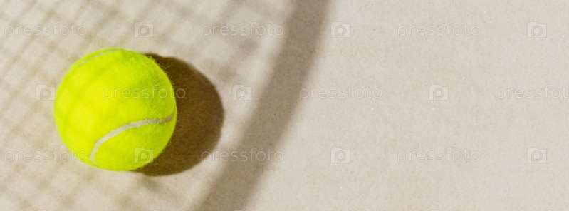 Теннисный баннер с теннисным желтым мячом на песчаном пляже с тенью от ракетки. Соревнования по теннису, здоровый спорт и концепция активного отдыха. Плоская планировка, размер баннера, пространство для копирования