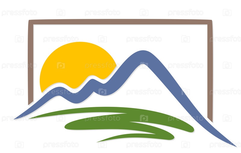 Логотип рассвета солнца с горами и лугом