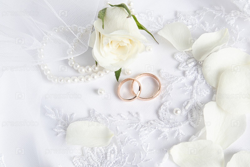 Праздничный свадебный фон. Два золотых обручальных кольца среди лепестков белых роз на атласной ткани и кружевном тюле. Вид сверху