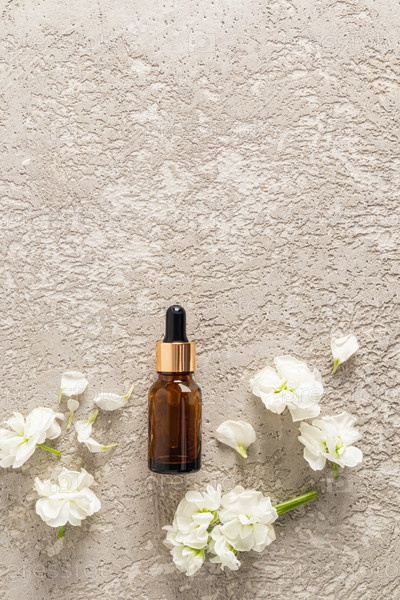 Флакон-пипетка из янтарного стекла с антивозрастным, омолаживающим и увлажняющим средством для ухода за кожей лица и тела. Вертикальный вид. Серый цементный фон