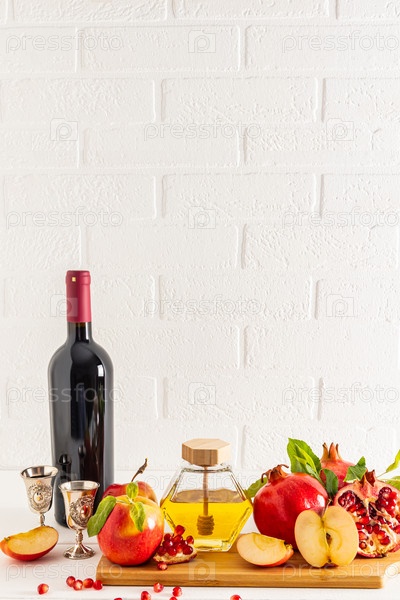Набор традиционных блюд и бутылка красного вина для Рош ха-Шана на фоне стены из белого кирпича. Вертикальный вид спереди. Копия пространства