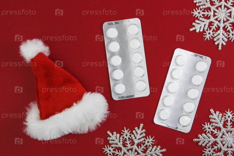 Медицинский рождественский фон. Таблетки, волдыри и шапка санта-клауса, на красном фоне со снежинками. категорически. Копировать пространство