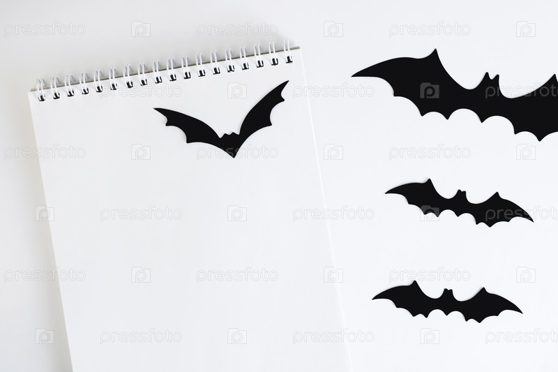 Пустой блокнот на белом фоне с силуэтами бумажных летучих мышей, традиционный декор Хэллоуина. Концепция планирования и организации осенних праздников, Хэллоуин. Флэтлей. Вид сверху. Справиться с пространством