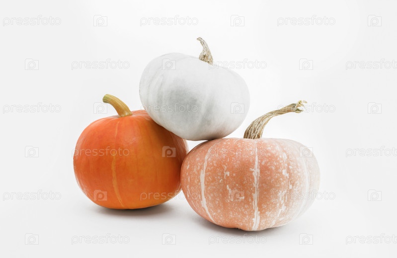 Тыквы, изолированные на белом фоне с тенью и тонким отражением. Спелые оранжевые, желтые и зеленые белые тыквы. Урожай
