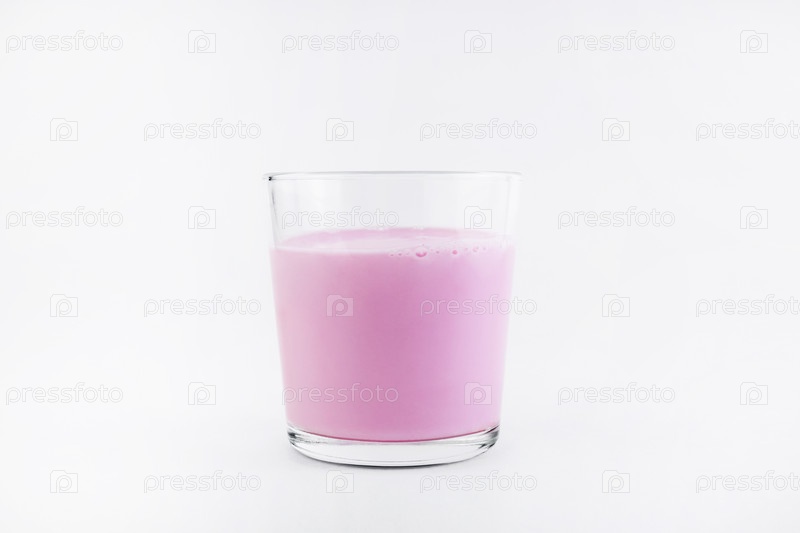 Розовое молоко пить молоко или йогурт, коктейль в стеклянном стакане на белом фоне. Молочно-протеиновый коктейль. Копировать пространство