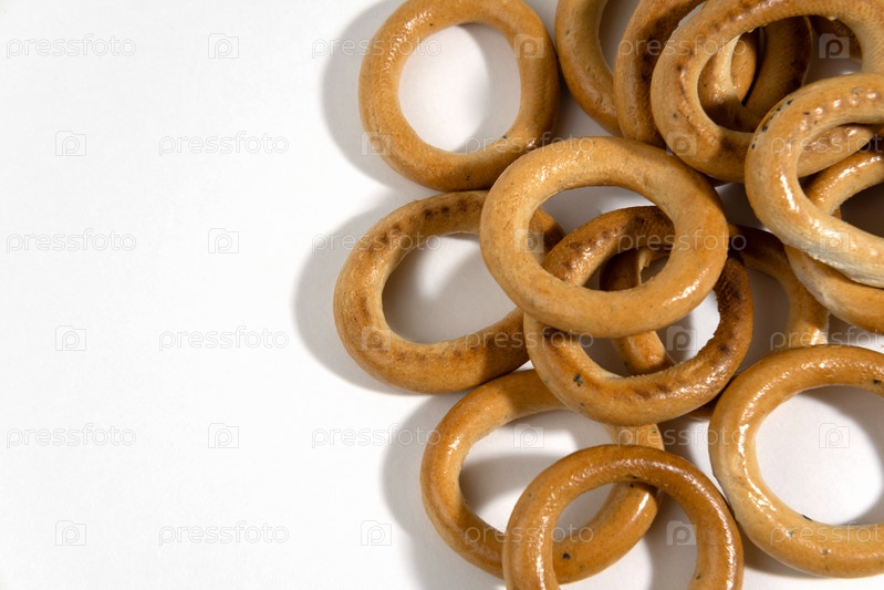 Традиционные русские народные блюда для чая, круглые или овальные сушки, изолированные на белом фоне. Сушеные запеченные рогалики. Десерт