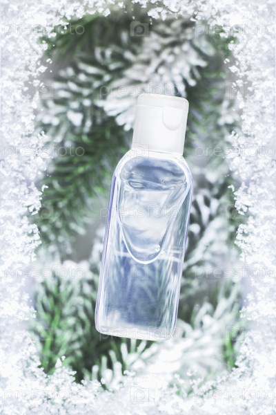 Прозрачный контейнер для жидкости на фоне рождественских ветвей и снега. Рождественская концепция косметики, подарков, распродажи. Вертикальный