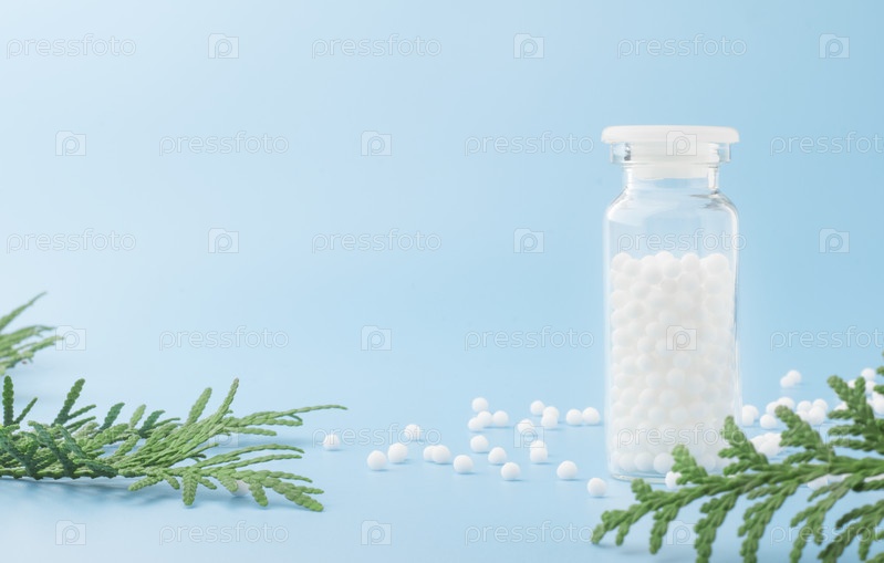 Гомеопатические глобулы и стеклянная бутылка рядом со свежими ветвями можжевельника крупным планом на синем фоне. Травы альтернативной гомеопатии. Баннер. Скопируйте пространство