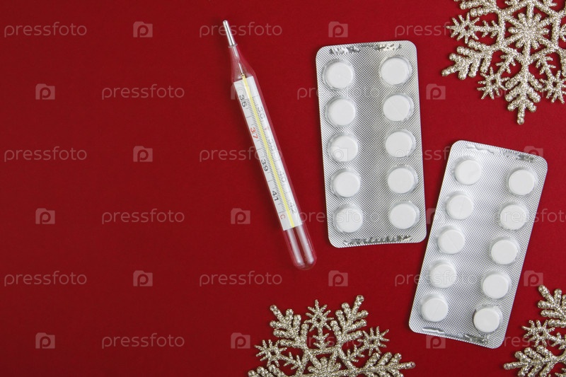 Медицинский рождественский фон. Таблетки, блистер и термометр на красном фоне со снежинками. категорически. Копировать пространство