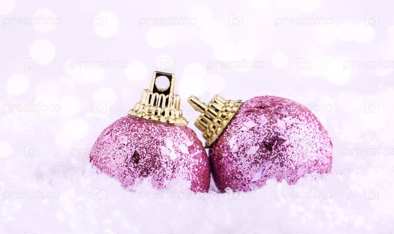 Новогодняя открытка в розовых тонах. Винтажные рождественские шары на снегу на фоне боке. Баннер. Копировать пространство