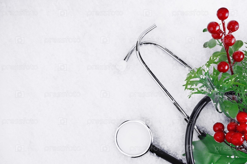 Медицинский стетоскоп на снежном фоне возле рождественской ветки. Медицинская концепция на Рождество или Новый год. категорически. Копировать пространство