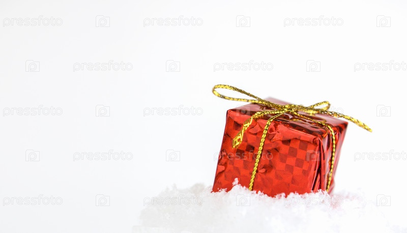 Подарок в красной упаковке на снегу. Выборочный фокус. Концепция на рождество или новый год, подарки, рождественские покупки или распродажи. Баннер. Копировать пространство