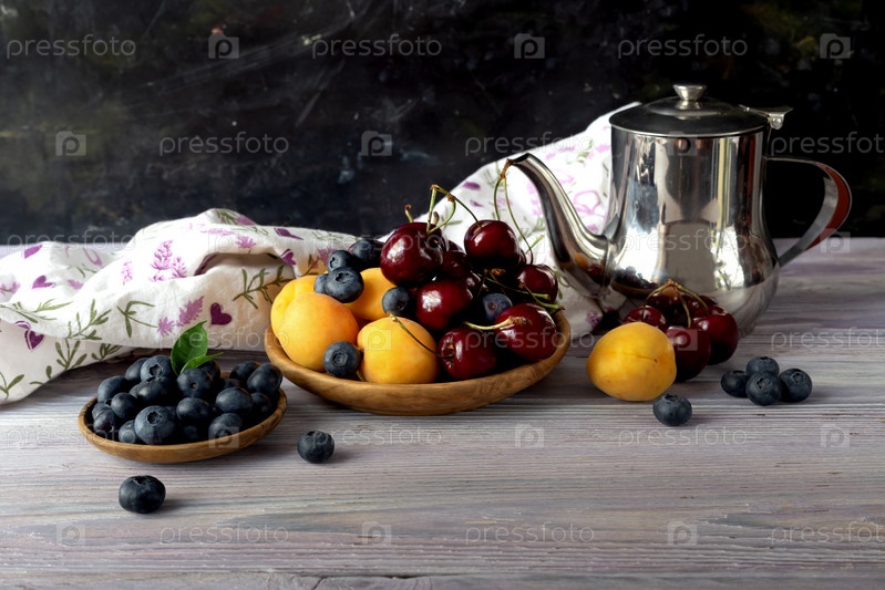 Натюрморт с абрикосами, вишней и черникой на деревянном столе