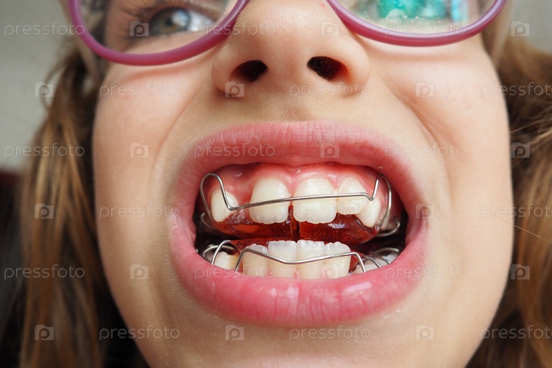 Детский ортодонтический протез. Металлопластиковые протезы на челюсти европеоидной девочки 9 лет. Исправление кривых зубов, формирование прикуса. Стоматология и ортодонтия. Проволочные зубы