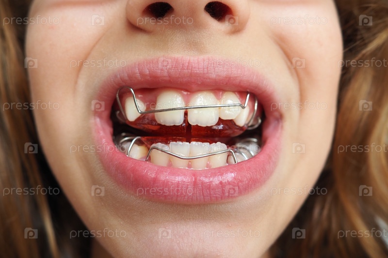 Ортодонтический протез. Металлопластиковые протезы на челюсти европеоидной девочки 9 лет. Исправление кривых зубов, формирование прикуса и красивой улыбки. Стоматология и ортодонтия