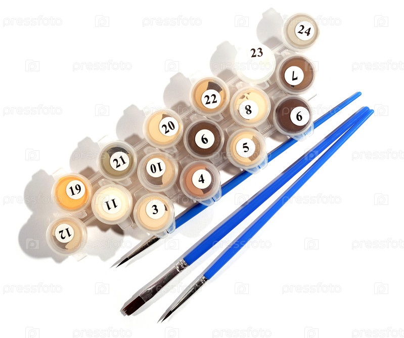 Три художественные кисти синего цвета лежат возле банок с акриловой краской