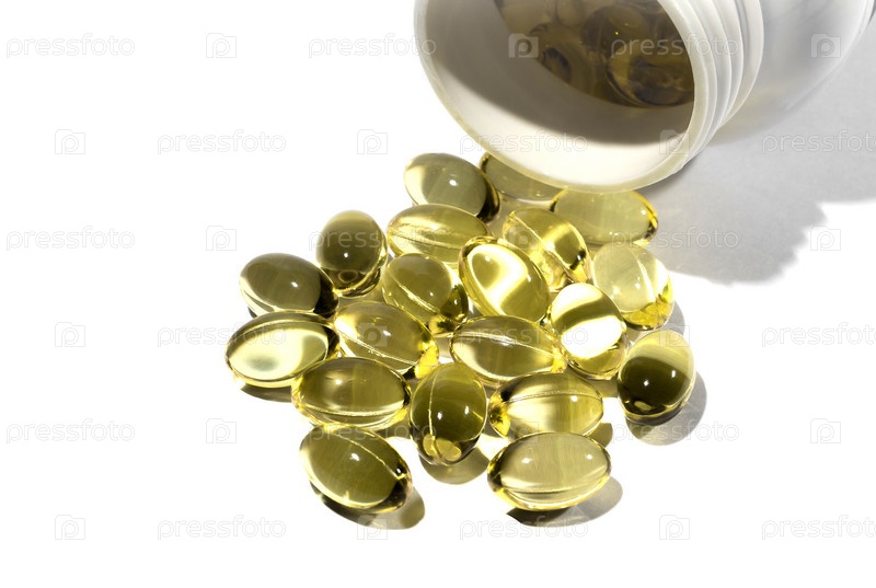 Капсулы из рыбьего жира на горле медицинской банки сфотографированы крупным планом на белом фоне