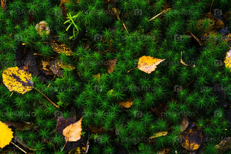 Зеленый мох сфотографирован крупным планом. Текстура. Фон для дизайнера. Желтые опавшие листья лежат сверху