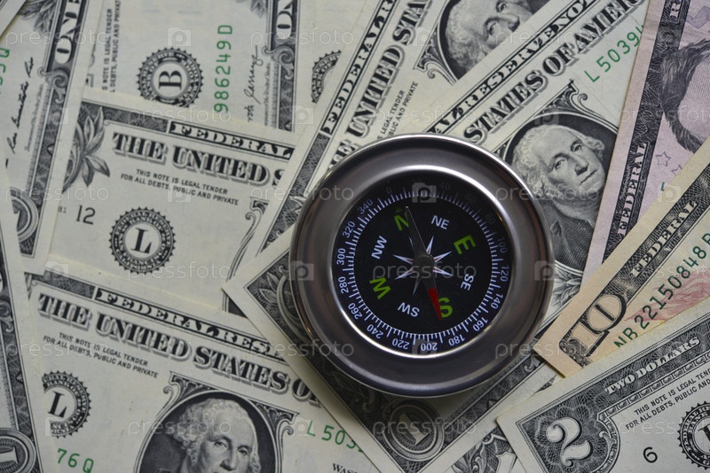 Компас и банкноты. Доллары США. Навигация в финансовом мире