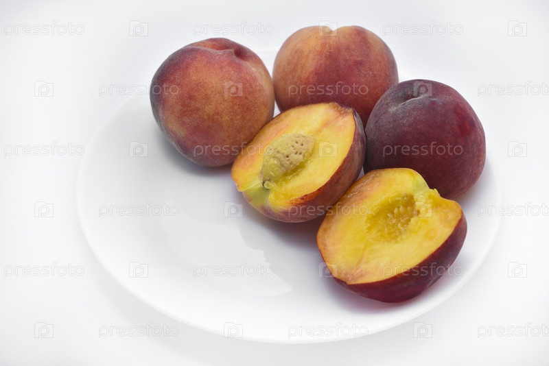Сочные персики на белой тарелке. Желто-красные крупные спелые персики. Сочные фрукты