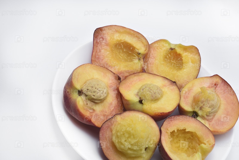 Сочные персики на белой тарелке. Желто-красные крупные спелые персики. Сочные фрукты