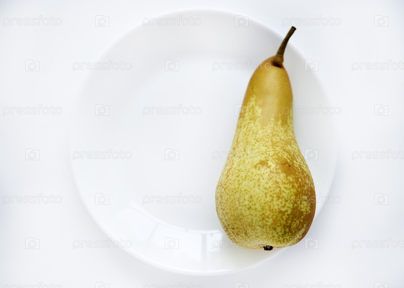 Свежие фрукты. Зеленая груша на белой тарелке. Нарезанная груша