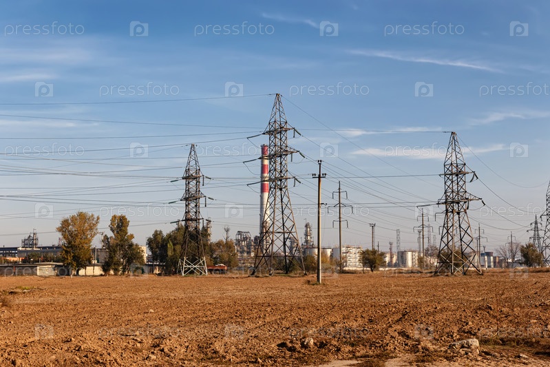 Высоковольтная линия электропередач проходит рядом с химическим заводом