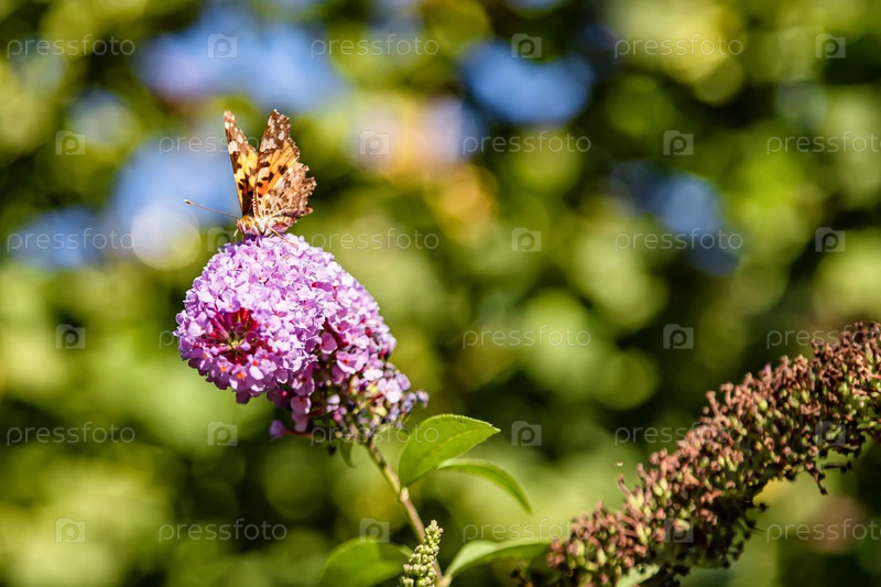 Бабочка пьет нектар из садового цветка и таким образом производит опыление