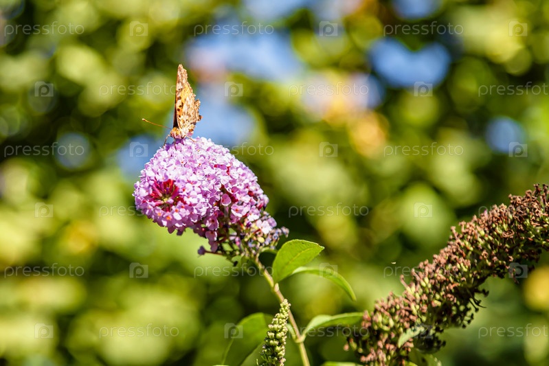 Бабочка пьет нектар из садового цветка и таким образом производит опыление