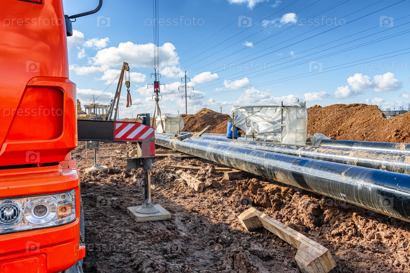 Строительные работы по укладке трубопровода в траншею с помощью крана