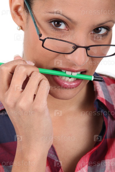 Женщина кусает карандаш