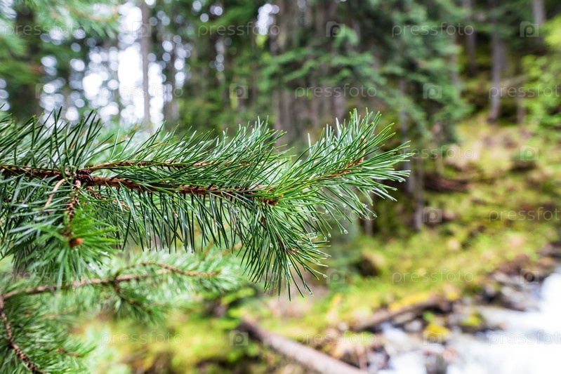 Сосновая ветка с росой на хвое на фоне бурной горной реки