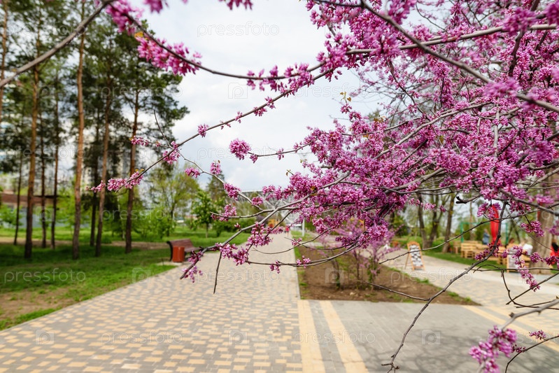 Красивое цветение весной с большим количеством маленьких розовых цветов