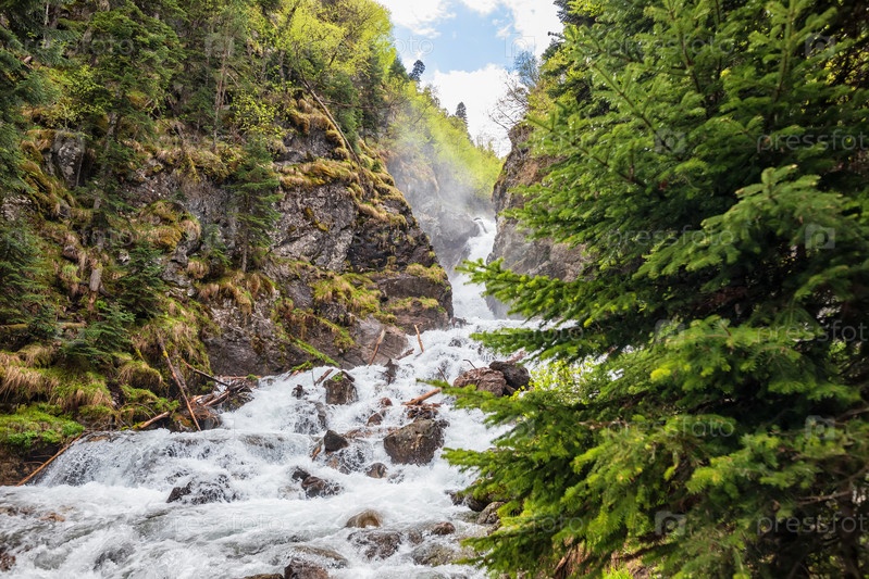 Быстрый горный ручей в сосновом лесу